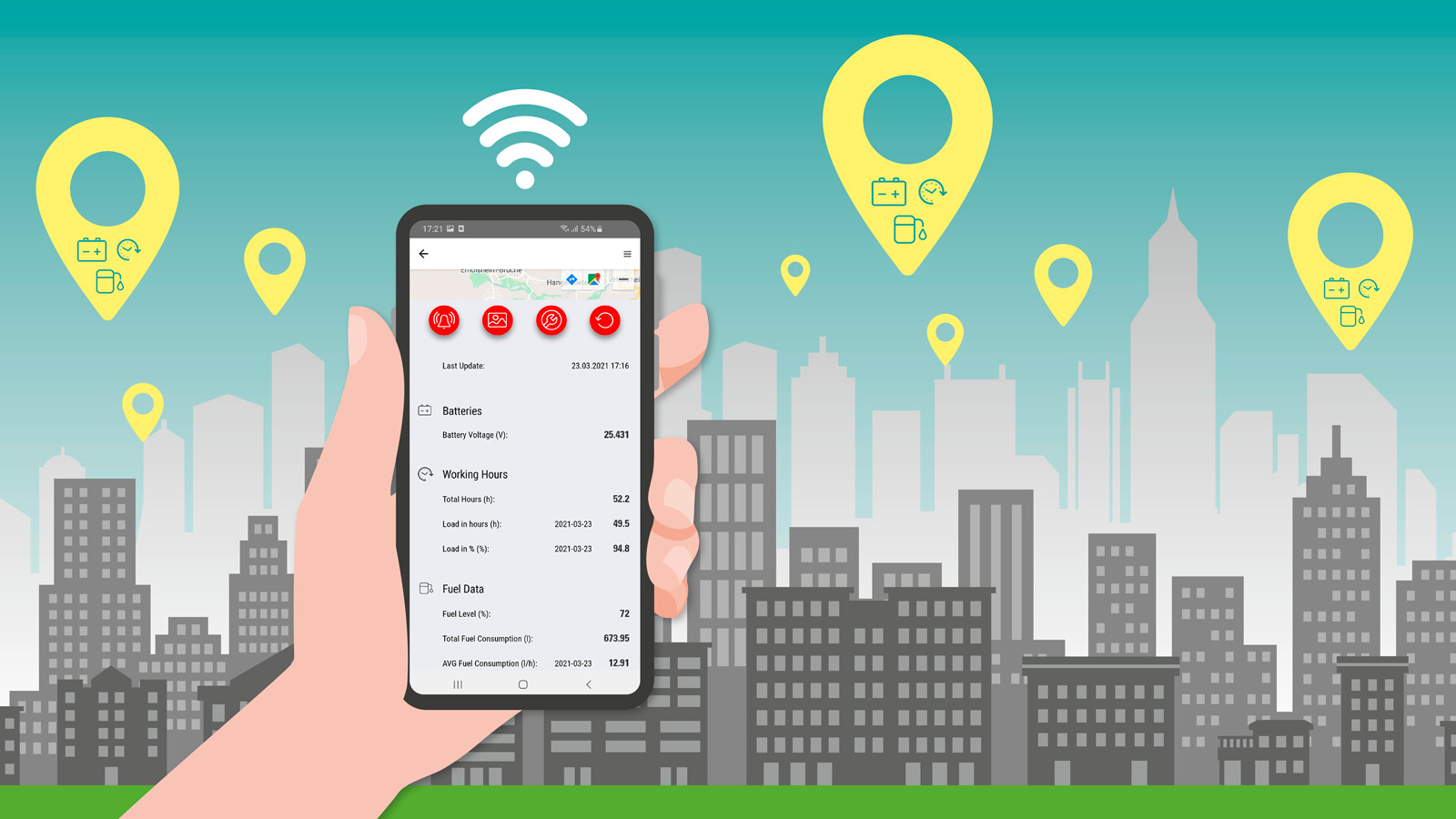 ServiceLink le ofrece la posibilidad de tener a la vista todas sus máquinas y su estado en todo momento. Vea información relevante sobre el mantenimiento, el estado de la batería...